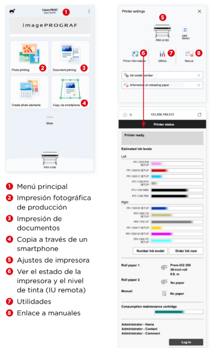 Además, permite supervisar el estado de impresión e intervenir incluso de forma remota. Es compatible con la mayoría de impresoras imagePROGRAF actuales y con los sistemas PlotWave y ColorWave.