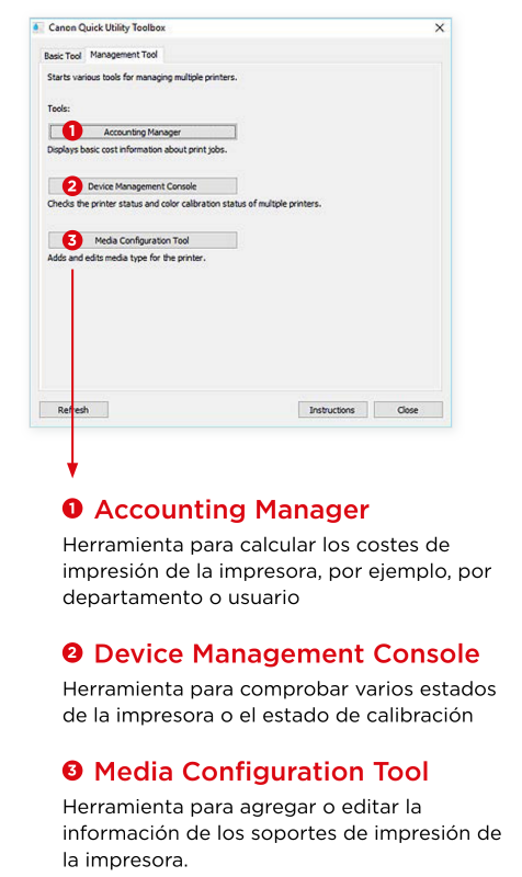 - Administration Tool: te lleva a las herramientas de software independientes, Accounting Manager, Device Management Console y Media Configuration Tool con un solo clic. Estas herramientas se deben instalar previamente de forma manual.