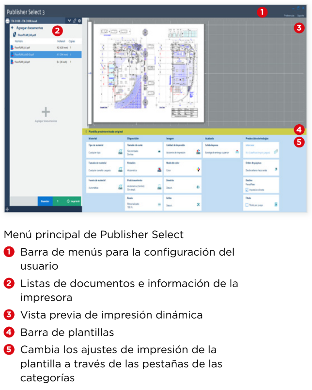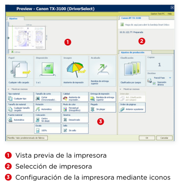 Controlador de gran formato certificado por Microsoft que reduce errores y optimiza el uso de soportes. Permite configurar la impresión en un solo paso desde un menú intuitivo.