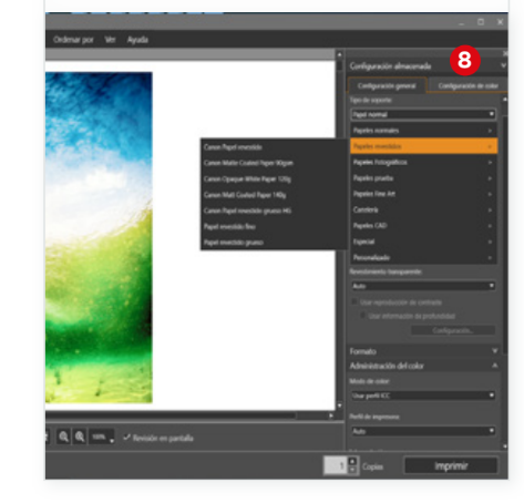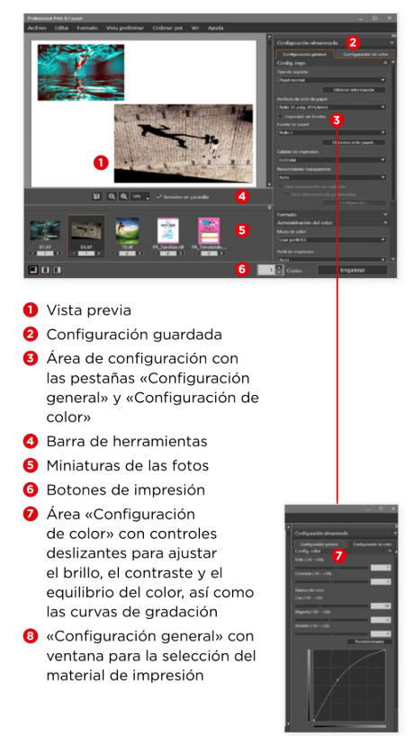 Ofrece amplias opciones como impresión de índices, blanco y negro e impresión con perfiles ICC para máxima precisión de color, incluyendo pruebas en pantalla (soft proof) que simulan el resultado final.