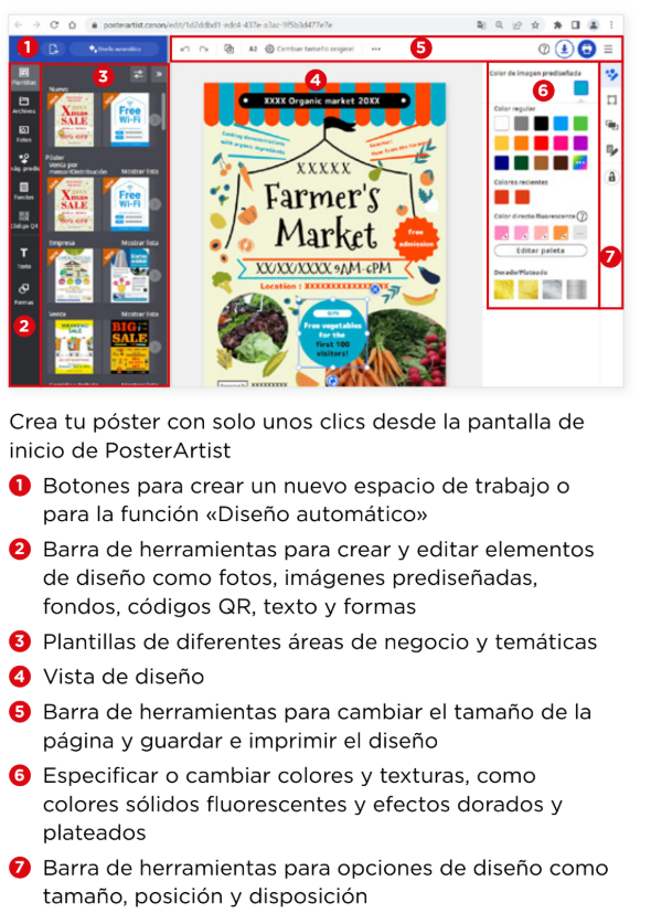 Crea e imprime en gran formato material informativo y promocional con calidad profesional. Incluye cientos de plantillas editables y acceso a millones de imágenes gratuitas de Pixabay, Unsplash y Pexels.