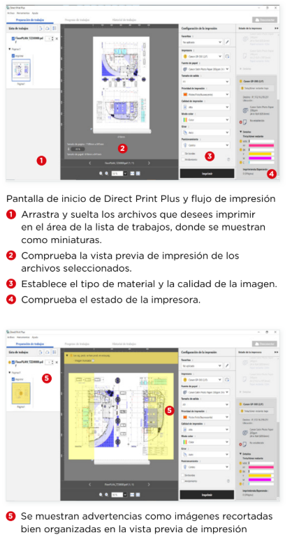 Su vista previa muestra la disposición óptima, alertas de material restante o imágenes fuera del área de impresión, reduciendo errores y desperdicio. Incorpora un motor PDF desarrollado por Canon que acelera el procesamiento mediante renderizado por unidades de documento.