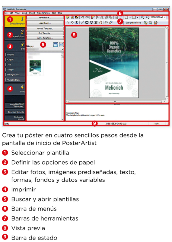 Incluye soporte para tinta fluorescente en modelos IPF GP y efectos dorados o plateados para diseños más llamativos. Guarda tu póster en tu ordenador, en la nube o envíalo directamente a la impresora, configurando tipo de soporte, calidad, corte automático o impresión sin bordes, con la posibilidad de crear preajustes para trabajos frecuentes.
