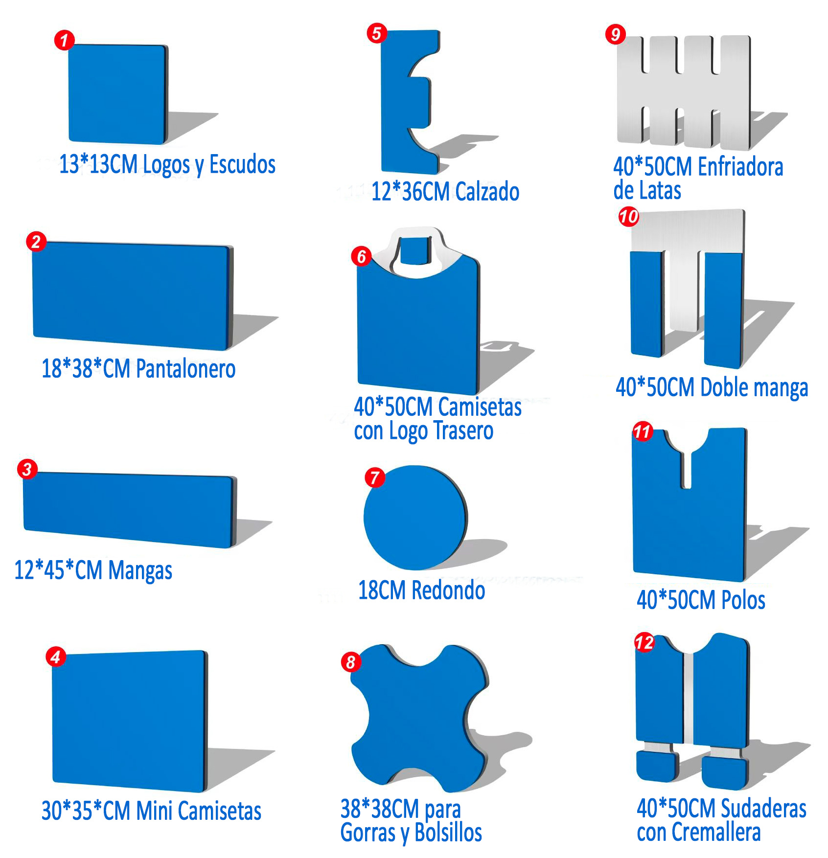 Dispones de soluciones específicas para cada aplicación: plato para etiquetas, pantalones, mangas, mini camisetas, zapatos, camisetas con logo frontal y trasero, plato redondo, sombreros, enfriadoras de latas, mangas dobles y polos. Cada uno pensado para adaptarse perfectamente a distintos formatos y mejorar la eficiencia en tu producción.