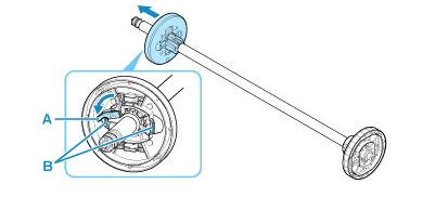- Finalmente, coloque nuevamente el tope del soporte desde el lado izquierdo en dirección al soporte del rollo. Sujete la placa del extremo (B), presione con firmeza hasta que la brida del tope del soporte (A) quede en contacto con el rollo, y gire la palanca del tope hacia la posición de cierre para bloquear el conjunto.