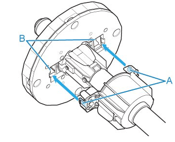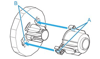 - En caso de utilizar un rollo con tubo de 3 pulgadas, será necesario colocar la sujeción correspondiente. Para ello, alinee las pestañas de la sujeción de tubo de 3 pulgadas (A) con los orificios del soporte del rollo (B) e insértelas firmemente hasta que encajen en su lugar.