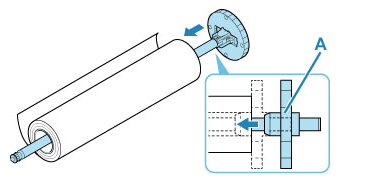 - A continuación, sitúe el rollo con el borde inicial del papel orientado hacia adelante. Inserte el soporte del rollo desde el lado derecho, empujándolo con firmeza hasta que el extremo del papel quede apoyado contra la brida (A) del soporte.