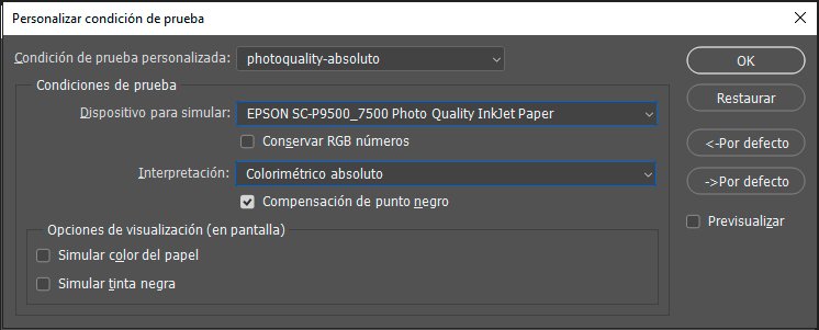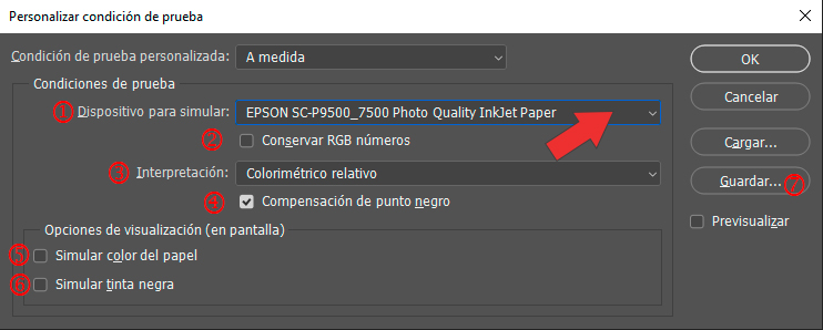 Puedes elegir un ajuste predefinido en la sección Dispositivo para simular (1) , seleccionamos el perfil ICC que corresponda al papel y la impresora (en nuestro caso EPSON SC-P9500_P7500 Photoquality Inkjet Paper) con los que imprimiremos.