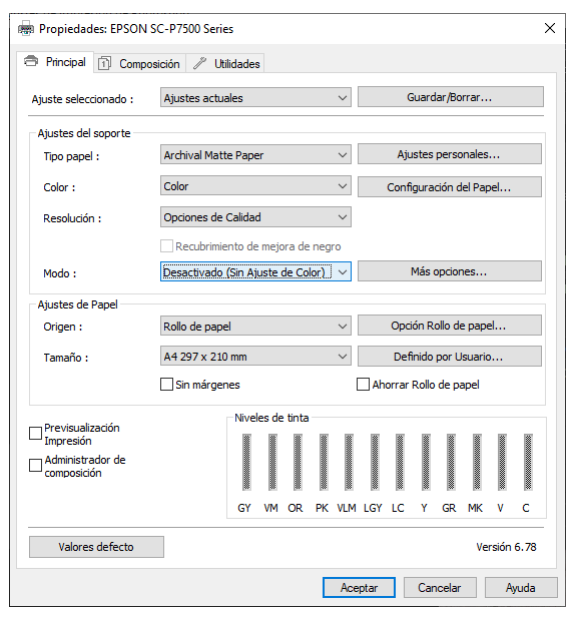 Volvemos a repetir lo importante es que desde el selector Modo esté indicado la opción Sin ajuste de color, esto es así porque queremos, como así hemos indicado en la aplicación (photoshop en el ejemplo) que sea esta quien realice la gestión del color, no el controlador de la impresora, y no puede haber duplicidad de gestión de color.
