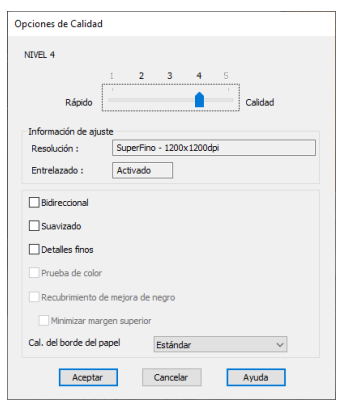 Para elegir el nivel de calidad pulsamos sobre el desplegable Resolución > opciones de calidad para seleccionar el nivel de calidad 4 hasta 1200×1200 ppp. (calidad medio alta) que es la resolución a la que queremos imprimir.