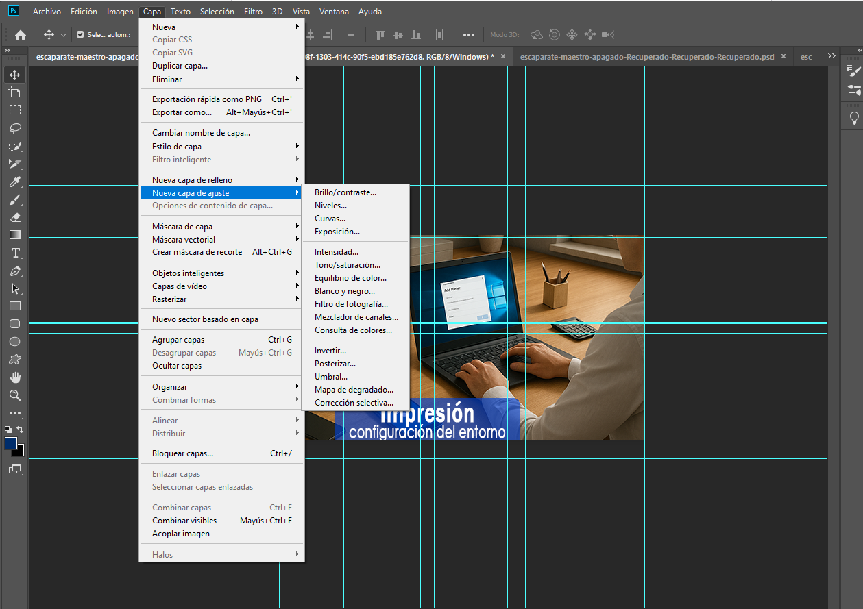 Para ello, lo más recomendable es usar capas de ajuste (Curvas, Niveles, Tono/Saturación) de forma que puedas adaptar la imagen a las condiciones reales de impresión sin alterar el archivo original.