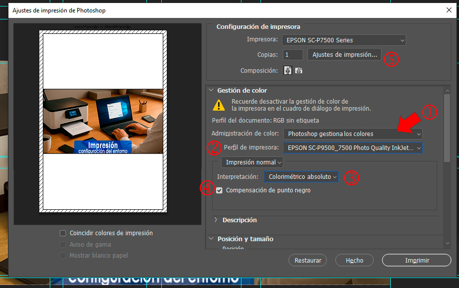Una vez ajustada y corregida la imágen ayudándonos de la vista de pruebas en pantalla abrimos la opción de impresión (Ctrl P en windows o comando + P en Mac), nos aparecerá el cuadro de diálogo de Ajustes de impresión.