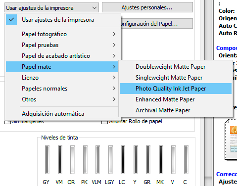 Desde el cuadro de configuración de las propiedades de impresión seleccionamos el tipo de papel a imprimir, siguiendo el ejemplo, para un papel mate tipo Truecolor 180 g, Puedes elegir el ajuste Photo Quality Inkjet Paper (Mate), que es el que venimos usando para la visualización previa y es el mismo que utilizamos en la configuración de photoshop para que realice la gestión de color.