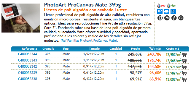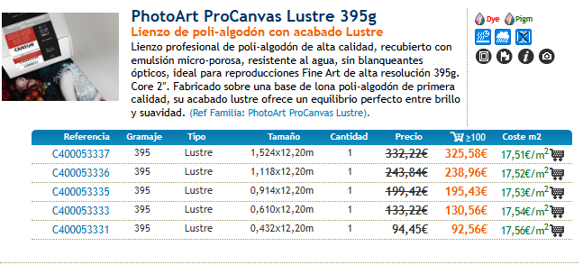 El Canson Infinity PhotoArt ProCanvas está disponible en acabado mate y lustre, permitiendo elegir el aspecto que mejor se adapte a cada tipo de imagen. El PhotoArt ProCanvas mate ofrece un resultado más suave, ideal para obras artísticas o reproducciones que buscan una estética similar a la pintura. Por su parte, el PhotoArt ProCanvas lustre aporta una ligera luminosidad adicional y una mayor densidad en los negros, favoreciendo imágenes con colores intensos o contrastes más marcados.